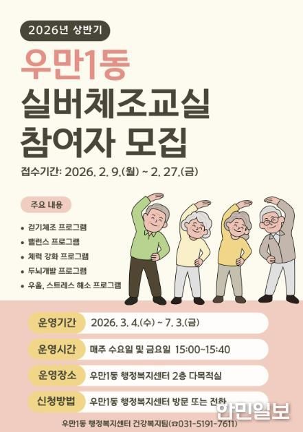한민일보 서울포커스 진광성 기자 | 수원시 팔달구 우만1동은 관내 어르신들의 건강 증진을 위해 2월 9일부터 2월 27일까지 ‘2026년 상반기 실버체조교실’ 참여자를 선착순으로 모집한다고 밝혔다.