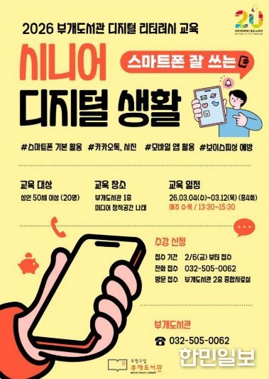 한민일보 서울포커스 김성혜 기자 | 부평구문화재단 부개도서관은 오는 3월, 어르신들의 디지털 활용능력(리터러시)을 높이기 위한 교육 ‘시니어 디지털 생활’ 프로그램을 운영·모집한다고 밝혔다.