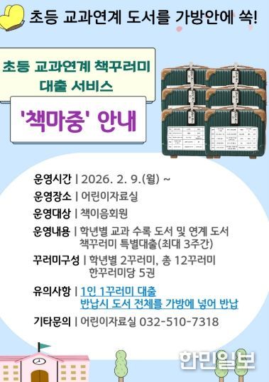 한민일보 서울포커스 유창렬 기자 | 인천광역시교육청부평도서관은 9일부터 어린이자료실에서 초등교과 연계 책꾸러미 대출 서비스 ‘책마중’을 운영한다.