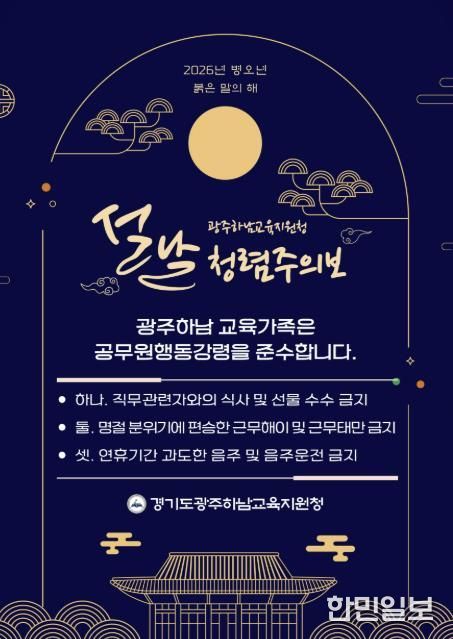 한민일보 서울포커스 임경복 기자 | 경기도광주하남교육지원청은 2월 9일, 2026년 병오년 설명절을 맞아 관내 교직원들이 청렴한 마음가짐으로 새해를 시작할 수 있도록‘교육장 청렴서한문’과‘청렴주의보’를 각급 학교에 전달했다.