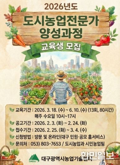 한민일보 서울포커스 김봉순 기자 | 대구광역시농업기술센터는 단순한 농사 기술 습득을 넘어 도시 생태계 보전과 정서 함양 등 도시농업을 선도할 시민을 대상으로 ‘2026년도 도시농업전문가 양성과정’을 운영한다.