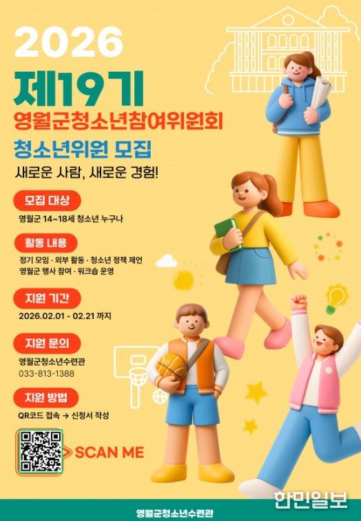 한민일보 서울포커스 진광성 기자 | 영월군청소년수련관은 관내 중~고등학교 청소년을 대상으로 오는 21일(토)까지 영월군청소년참여기구 신규, 연임 위원을 추가 모집한다.