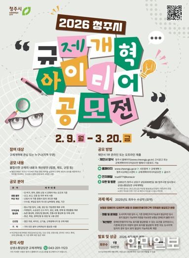한민일보 서울포커스 김다남 기자 | 청주시는 시민이 체감할 수 있는 다양하고 창의적인 규제개혁 아이디어를 발굴해 일상생활과 경제활동을 제약하는 규제를 적극 개선하고자 ‘2026 청주시 규제개혁 아이디어 공모전’을 개최한다고 8일 밝혔다.