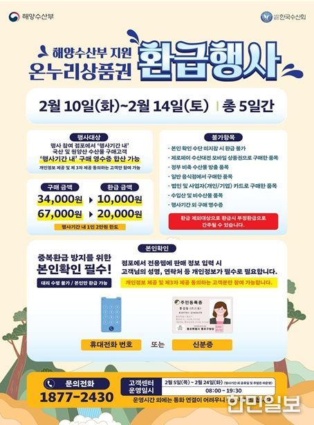 환급 기준은 3만 4,000원 이상 구매 시 1만 원, 6만 7,000원 이상 구매 시 2만 원을 온누리상품권으로 각각 돌려받을 수 있다. 단, 지급되는 온누리상품권이 소진될 경우 조기 종료될 수 있다.