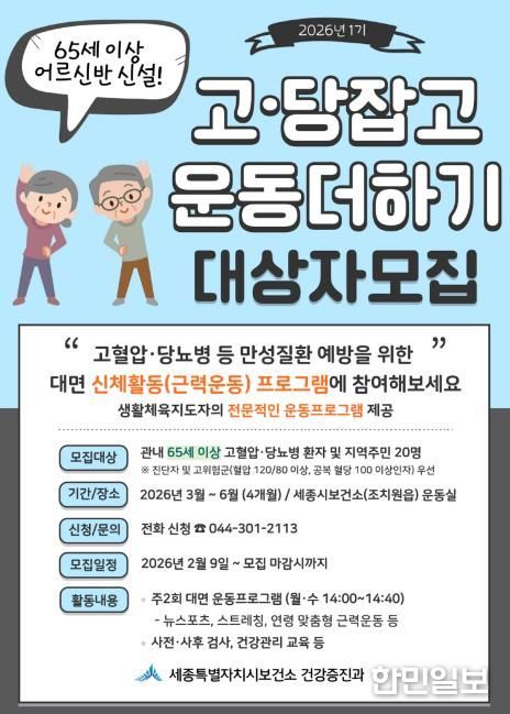 한민일보 서울포커스 임경복 기자 | 세종특별자치시보건소가 오는 3월부터 ‘2026년 고·당 잡고, 운동 더하기’ 사업 확대 운영을 통해 65세 이상 어르신을 위한 맞춤형 운동교실을 새롭게 개설한다고 밝혔다.
