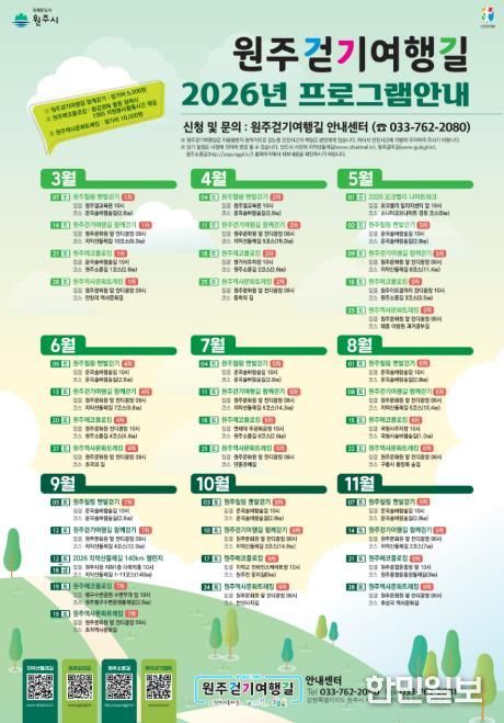 이 밖에도 ▲4월 맨발걷기 지도자 교육 ▲5월 오크밸리 나이트워크 ▲6월·9월 원주맨발걷기축제 ▲9월 치악산둘레길 140㎞ 챌린지 등 연중 다채로운 걷기 행사가 마련된다.