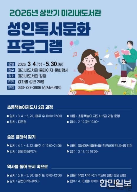 한민일보 서울포커스 임경복 기자 | 원주시 미리내도서관은 시민들의 문화 접근성을 높이기 위해 성인을 대상으로 상반기 독서문화 프로그램을 운영한다.