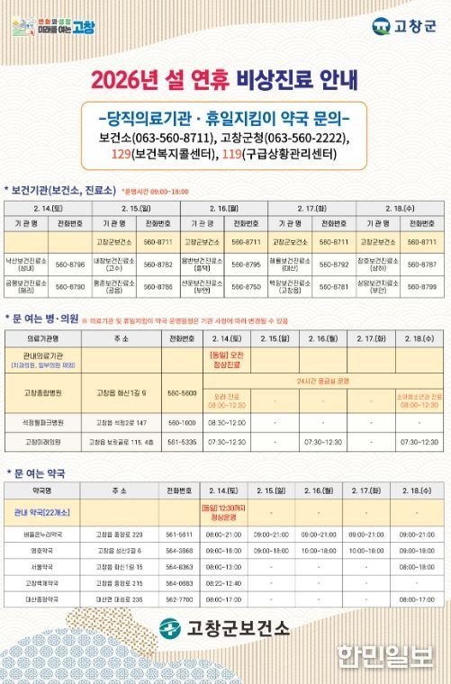 한민일보 서울포커스 박용남 기자 | 고창군이 설 연휴(14~18일) 군민의 건강을 지키고, 의료 이용 불편을 최소화하기 위해 비상진료체계를 가동한다.
