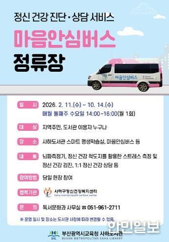 한민일보 서울포커스 임광현 기자 | 부산광역시립사하도서관은 오는 2월부터 10월까지 매월 둘째 주 수요일마다 도서관 스마트 평생학습실과 마을안심버스에서 지역주민을 대상으로 ‘마을안심버스 정류장’을 운영한다.