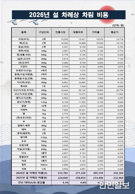 공사는 명절(설·추석) 차례상 차림에 수요가 높은 주요 성수품 34개 품목(6~7인 가족 기준)의 구매비용을 조사해 매년 발표하고 있으며, 금년도 조사 결과 올해 전통시장 구매비용은 233,782원, 대형마트 구매비용은 271,228원으로 전년 대비 각각 4.3%, 4.8% 상승했다.