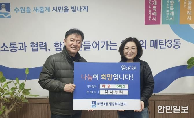 한민일보 서울포커스 진광성 기자 | 수원시 영통구 매탄3동 행정복지센터는 지난 6일, 관내 폐기물 수거업체인 ㈜나누리로부터 설 명절을 맞아 어려운 이웃을 위한 라면 15박스를 기탁받았다고 밝혔다.