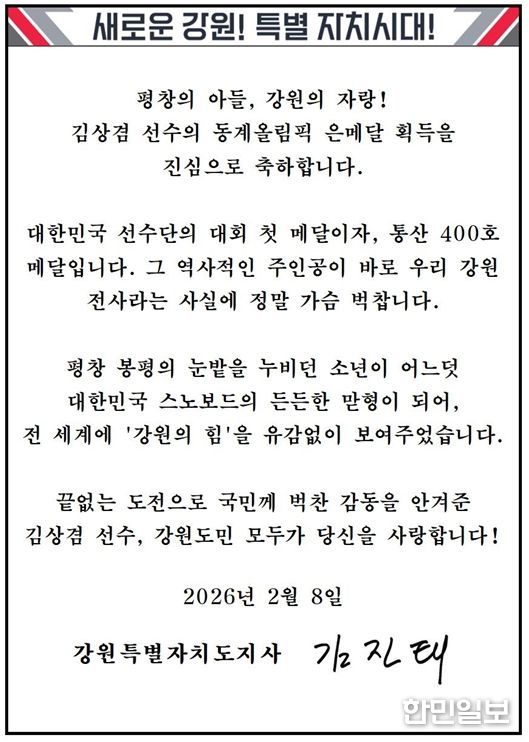 한민일보 서울포커스 최성훈 기자 | 김진태 도지사는 8일 2026 밀라노-코르티나담페초 동계올림픽대회에서 강원특별자치도(하이원 스포츠단) 소속 김상겸 선수의 남자 스노보드 평행대회전 은메달 획득을 축하하며, 축전을 보냈다.