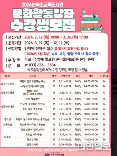 한민일보 서울포커스 곽중희 기자 | 속초교육도서관은 관내 학생 및 학부모·지역주민들의 지속 가능한 배움을 통한 자기성장을 위해 ‘2026년 문화활동강좌’ 수강생을 모집한다.