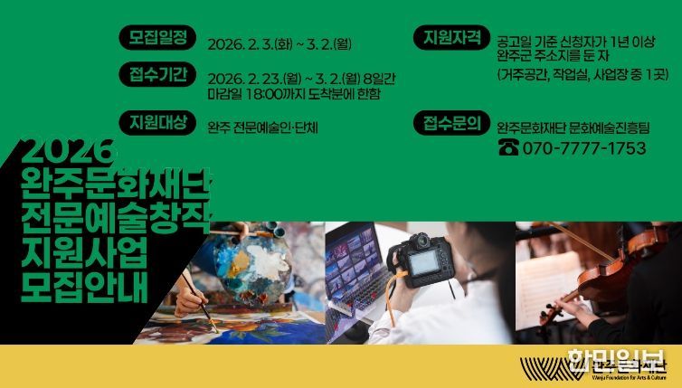 한민일보 서울포커스 박용남 기자 | (재)완주문화재단(이사장 유희태)은 2026년 한 해 동안 지역 예술인의 안정적인 창작활동을 지원하기 위해 2026 전문예술창작지원사업에 참여할 예술인 및 예술단체를 모집한다.