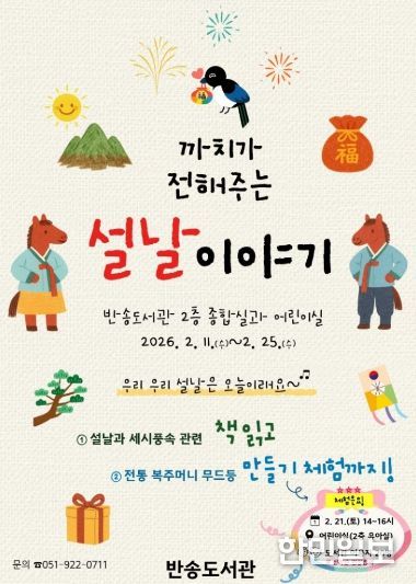 한민일보 서울포커스 임광현 기자 | 부산광역시립반송도서관(관장 박미양)은 우리나라 대표 전통 명절 설날을 맞아 사학특성화 프로그램 ‘까치가 전해주는 설날 이야기’를 오는 11일부터 25일까지 운영한다.