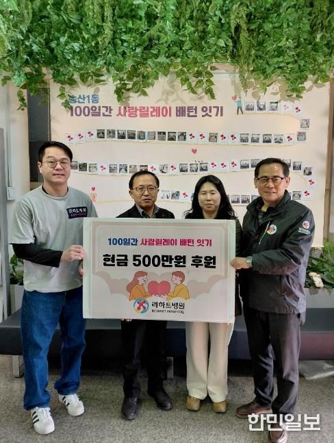 한민일보 서울포커스 심기옥 기자 | 의정부시 송산1동주민센터는 2월 9일 용현동 소재 리하트병원이 ‘100일간 사랑릴레이 배턴 잇기’에 동참해 성금 500만 원을 기탁했다고 밝혔다.