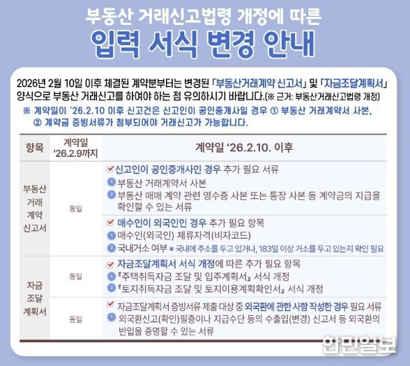 한민일보 서울포커스 임광현 기자 | 여수시는 2월 10일부터 '부동산 거래 신고 등에 관한 법령'이 변경됨에 따라 부동산 거래계약 신고 시 추가 서류를 제출하여야 한다고 밝혔다.