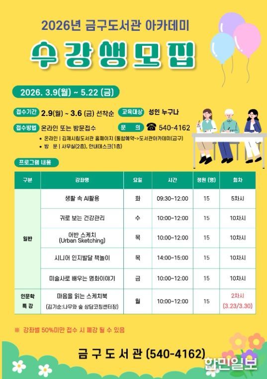 한민일보 서울포커스 박용남 기자 | 김제시 금구도서관은 지역 주민들의 자기 계발과 문화 향유 기회를 확대하기 위해 2026년 금구도서관 아카데미 수강생을 오는 3월 6일까지 선착순 모집한다고 밝혔다.