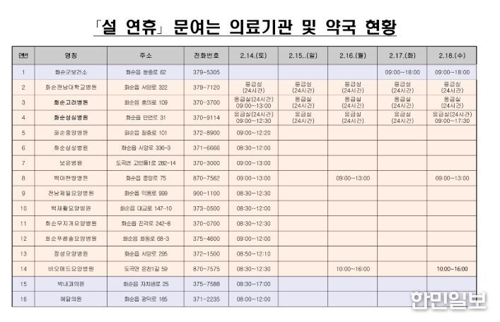 한민일보 서울포커스 박용남 기자 | 화순군은 설 명절을 맞아 귀성객과 군민의 안전을 위해 오는 2월 14일부터 2월 18일까지 비상응급의료 상황반을 운영한다고 밝혔다.