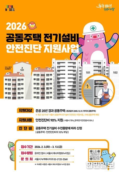 한민일보 서울포커스 국용호 기자 | 서울시는 노후 공동주택의 정전사고를 사전에 차단하고, 시민 생활안전을 강화하기 위해 ‘2026년 공동주택 전기설비 안전진단 지원사업’을 추진한다. 한국전기안전공사와 협력해 공동주택 전기설비의 적정 운전·관리 상태를 종합 진단하고, 진단비의 90%를 지원한다.