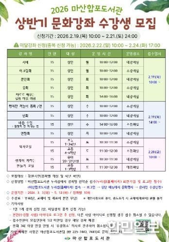 한민일보 서울포커스 김서윤 기자 | 창원특례시 마산합포도서관에서는 시민들에게 다양한 평생학습 기회를 제공하고자 ‘2026년 상반기 문화강좌’ 수강생을 2월 19일부터 2월 24일까지 마산합포도서관 누리집에서 온라인(선착순)으로 모집한다.