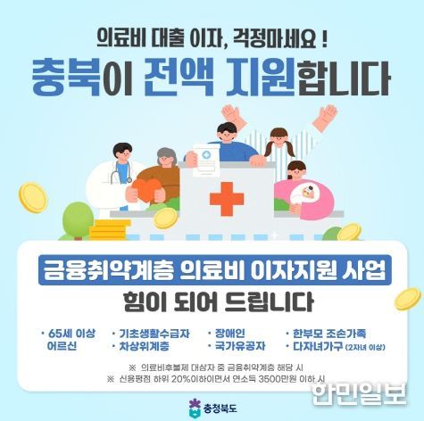 한민일보 서울포커스 임경복 기자 | 충북도는 의료 사각지대 해소를 위해 ‘금융취약계층 의료비 이자 지원사업’을 2월 11일부터 시행한다.