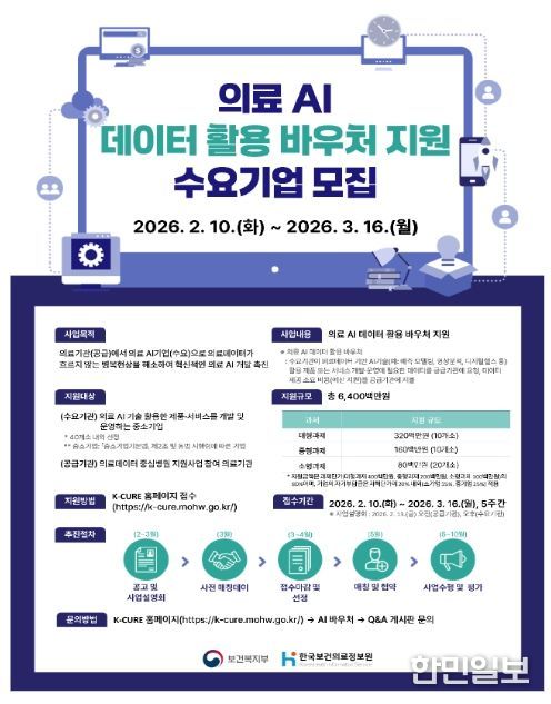 한민일보 서울포커스 임경복 기자 | 보건복지부와 한국보건의료정보원(원장 염민섭)은 안전한 의료데이터 활용 촉진을 위해 2월 10일부터 3월 16일까지'의료 AI 데이터 활용 바우처 지원사업'에 참여할 수요기업을 모집한다고 밝혔다.