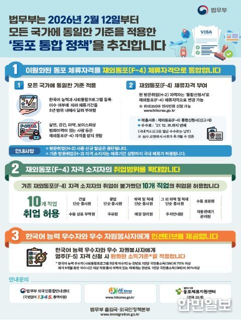 한민일보 서울포커스 임경복 기자 | 법무부는 2026년 2월 12일 국내․외 체류 동포 사회의 오랜 숙원이었던 '동포 체류자격(F-4) 통합' 조치를 시행한다고 밝혔다.