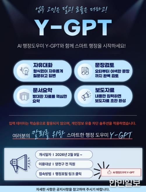 한민일보 서울포커스 곽동근 기자 | 양천구는 생성형 인공지능(AI)을 행정 업무에 안전하고 효율적으로 활용하기 위해 자체 AI 기반 업무지원 시스템인 ‘Y-GPT’를 구축하고, 지난 9일부터 본격 운영에 들어갔다고 밝혔다.