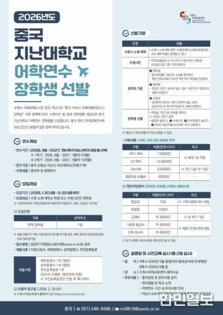 한민일보 서울포커스 진광성 기자 | 수원특례시는 2월 20일까지 ‘2026년도 지난대학교 어학연수 장학생 프로그램’ 참가자 1명을 모집한다.