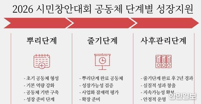 이학수 시장은 “줄기단계는 사업 아이템의 경쟁력을 높이는 과정이고 사후관리단계는 축적된 성과를 바탕으로 지속 가능성을 확보하는 과정”이라며 “시민창안대회를 통해 지역 공동체들이 자립 기반을 다지고 지역 경제 활성화의 주역으로 성장할 수 있도록 단계별 맞춤 지원을 아끼지 않겠다”고 말했다.