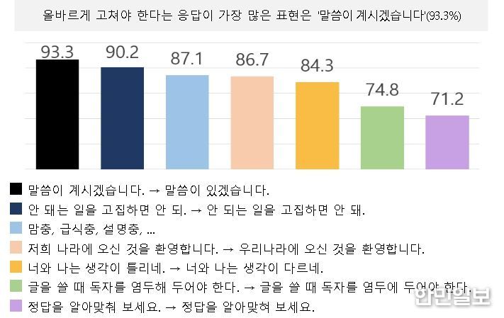 개선해야 한다는 응답이 가장 높게 나타난 항목은 ‘그 제품은 품절이십니다’, ‘커피 나오셨습니다’ 등 ‘과도한 높임 표현’으로, 응답자의 93.3%가 바꾸어 써야 한다고 응답했다. 개선이 필요하다고 응답한 비율이 70% 이상으로 높게 나타난 항목은 어법 오류, 부적절한 어휘 사용, 차별∙혐오 표현 등 영역별로 다양했다. 과도한 높임 표현 다음으로는 어법 오류 중 하나인 ‘되-돼’ 혼동(90.2%)을 개선해야 한다는 응답이 많았다. 이외에 국민은 ‘염두에 두다’ 사용 오류(74.8%)와 ‘(알아)맞추다-(알아)맞히다’ 혼동(71.2%)과 같은 어법 오류를 개선이 필요한 항목으로 꼽았다. 이어서 ‘-충(87.1%)’과 ‘장애를 앓다(78.7%)’와 같은 혐오∙차별 표현을 개선해야 한다는 응답이 70%를 훨씬 넘는 비율로 나타났다.