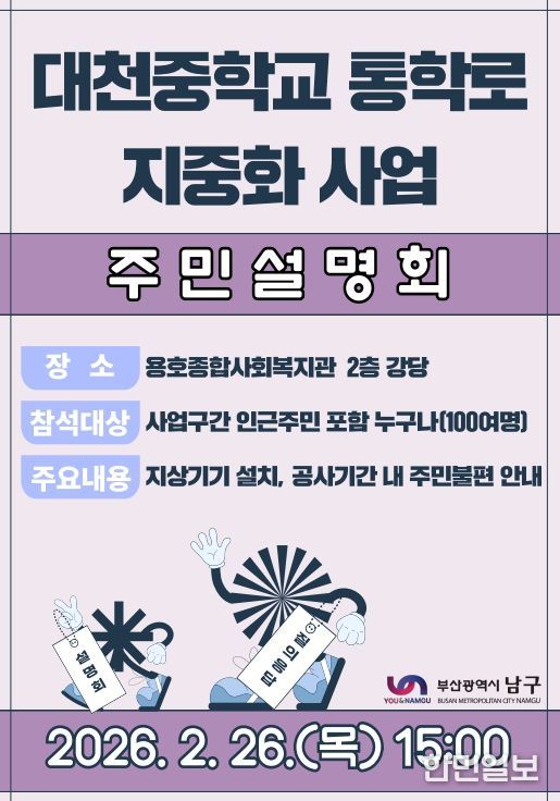 한민일보 서울포커스 임광현 기자 | 부산 남구는 '대천중학교 통학로 지중화사업'과 관련해 오는 2월 26일 오후 3시, 용호종합사회복지관 2층 강당에서 1차 주민설명회를 개최한다.