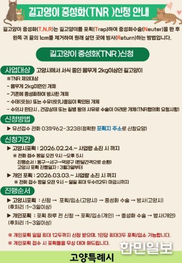 사업대상은 고양시에 서식하는 2kg이상의 길고양이로, 고양특례시 반려온뜰을 통해 신청할 수 있다. 고양시포획은 2월 24일 오전 9시부터, 개인포획은 3월 3일부터 오전 9시부터 일 최대 12두(개인별 3두내)까지 신청 가능하다.