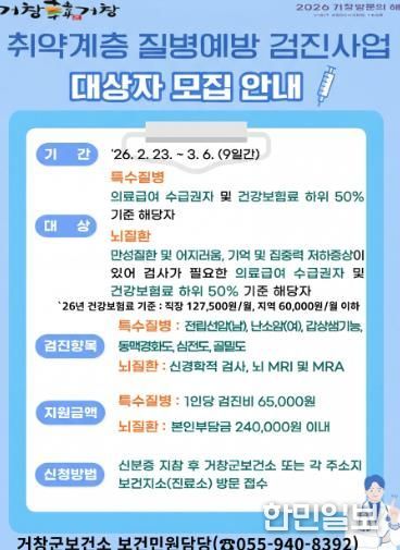 한민일보 서울포커스 김서윤 기자 | 거창군은 의료 취약계층의 질병 조기 발견과 경제적 부담 완화를 위해 ‘2026년 취약계층 질병 예방 검진사업’ 대상자를 모집한다.