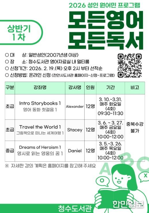 한민일보 서울포커스 황준형 기자 | 천안시 청수도서관은 오는 3~ 6월 원어민과 함께하는 성인 영어 프로그램 ‘모든 영어 모든 독서’를 운영한다고 13일 밝혔다.