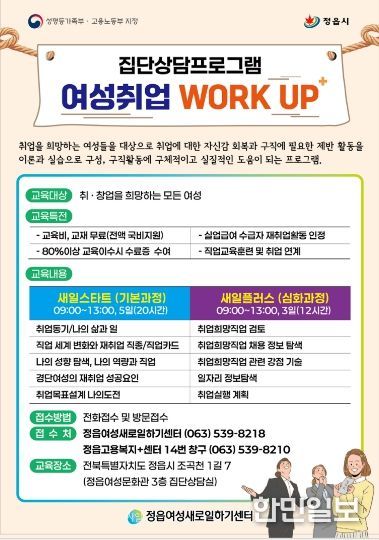 한민일보 서울포커스 김용택 기자 | 정읍여성새로일하기센터는 취업과 창업을 희망하는 여성들의 구직 역량을 강화하기 위해 ‘찾아가는 집단상담 프로그램’을 본격 운영한다. 이번 프로그램은 가족센터와 고용복지+센터 등 지역 기관과 연계해 현장 중심으로 진행된다.