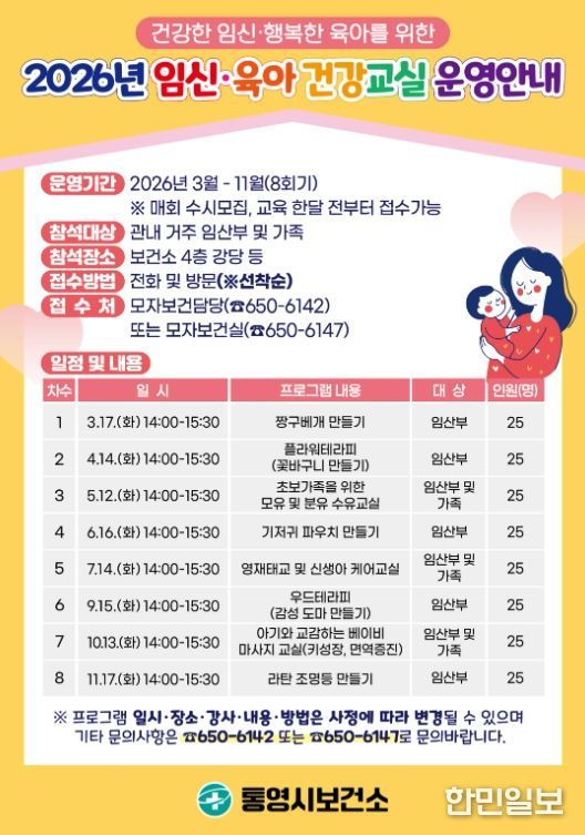 한민일보 서울포커스 김서윤 기자 | 통영시는 임산부와 예비부모의 초보육아의 어려움을 덜어 주고 안 정적인 태교 지원을 위해 2026년 3월부터 11월까지 매월 통영시보건소에서'임신·육아 건강교실'을 운영한다고 13일 밝혔다.