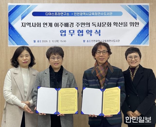 한민일보 서울포커스 유창렬 기자 | 인천광역시교육청연수도서관은 12일 디아스포라연구소(대표 이환회)와 ‘지역사회 이주민의 안정적 정착과 상호문화이해증진을 위한 업무협약’을 체결했다.