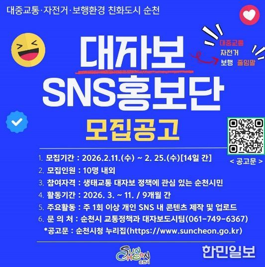한민일보 서울포커스 임광현 기자 | 순천시는 생태교통의 일환으로 추진 중인 ‘대자보’ 정책을 시민 눈높이에서 알리고자 '2026년 순천시 대자보 SNS 홍보단'을 모집한다고 밝혔다.
