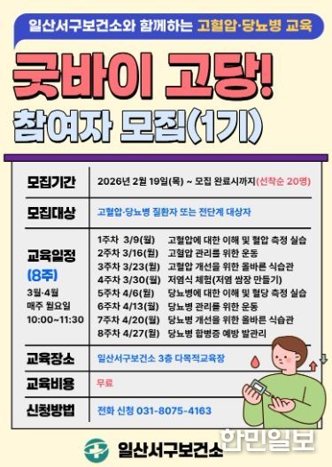 한민일보 서울포커스 김은금 기자 | 고양특례시 일산서구보건소는 지역주민의 고혈압·당뇨병 예방관리를 위해 2026년 ‘굿바이 고당! 교실’에 참여할 1기 참여자를 오는 19일부터 모집한다.