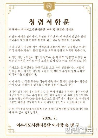 한민일보 서울포커스 임광현 기자 | 여수시도시관리공단(이사장 송병구)은 다가오는 설 명절을 맞아 임직원 및 관계자를 대상으로 ‘청렴서한문’을 발송했다고 밝혔다.