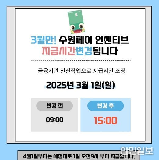 수원페이 인센티브 지급 시작 시각은 매달 1일 오전 9시였지만, 3월 1일 금융기관 전산 작업으로 인해 오후 3시로 늦춰진다. 4월부터는 다시 1일 오전 9시부터 지급한다.