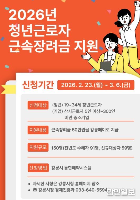 근속장려금 신청은 오는 23일부터 3월 6일까지이며, ‘강릉시 통합예약시스템’을 통해 청년 근로자 본인이 신청하면 된다.