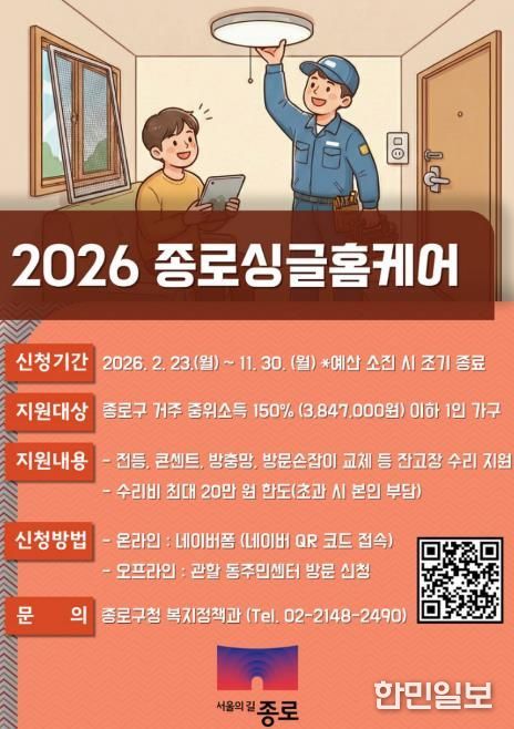 한민일보 서울포커스 김서윤 기자 | 종로구는 1인가구의 생활 불편을 해소하고 안전한 주거환경 조성을 위해 2월 23일부터 11월까지 소규모 고장 수리 지원사업 ‘종로 싱글홈케어’를 추진한다.