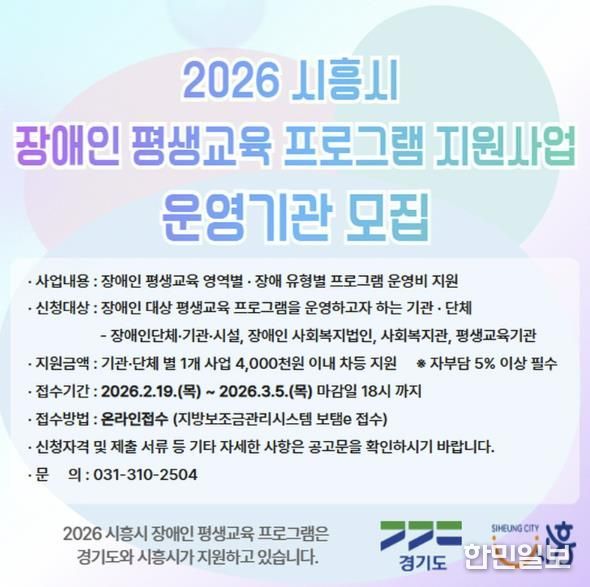 한민일보 서울포커스 유현민 기자 | 시흥시는 장애인의 학습권을 보장하고 사회참여 기회를 확대하기 위해 ‘2026년 장애인 평생교육 프로그램 지원사업’을 추진하는 가운데 운영기관을 모집한다.