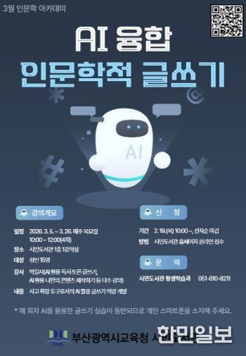 한민일보 서울포커스 임광현 기자 | 부산광역시립시민도서관은 다음달 5일부터 26일까지 매주 목요일 시민 대상 ‘AI 융합 인문학적 글쓰기’ 특강을 운영한다.