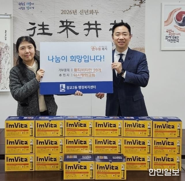 한민일보 서울포커스 진광성 기자 | 영통구 광교2동은 지난 13일 더사랑의교회가 지역사회 내 어려운 이웃을 돕기 위해 광교2동 행정복지센터에 멀티비타민 20통을 전달했다고 밝혔다. 이번 기부는 소외되기 쉬운 이웃들에게 따뜻한 마음을 전하고자 마련됐다.