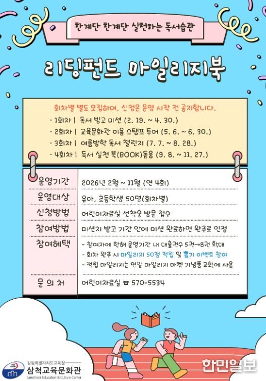 한민일보 서울포커스 곽중희 기자 | 삼척교육문화관은 관내 유아·초등학생을 대상으로 2월부터 11월까지 어린이 독서 실천 프로그램 ‘리딩펀드 마일리지북’을 운영한다.