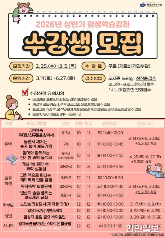 한민일보 서울포커스 곽중희 기자 | 횡성교육도서관은 지역 학생과 주민에게 다양한 문화예술 활동의 기회를 제공하고자 3월 14일부터 6월 27일까지 ‘2026년 상반기 평생학습강좌’를 운영한다